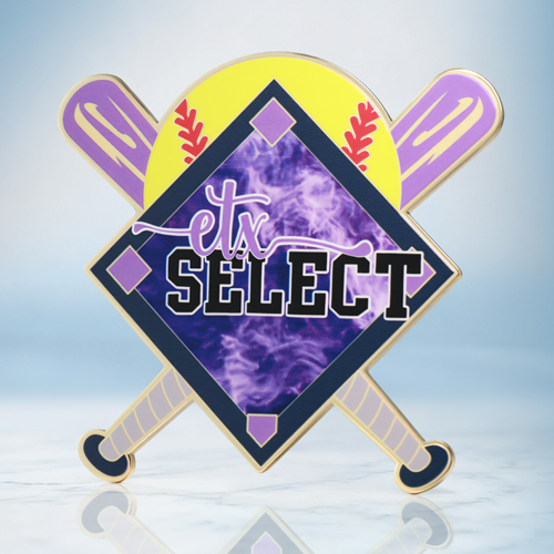 ETX Select Softball Trading Pins bring the energy with a bold, high-octane design! Featuring a unique diamond layout and striking purple flames, this custom softball trading pin is a must-have for any elite player’s collection.