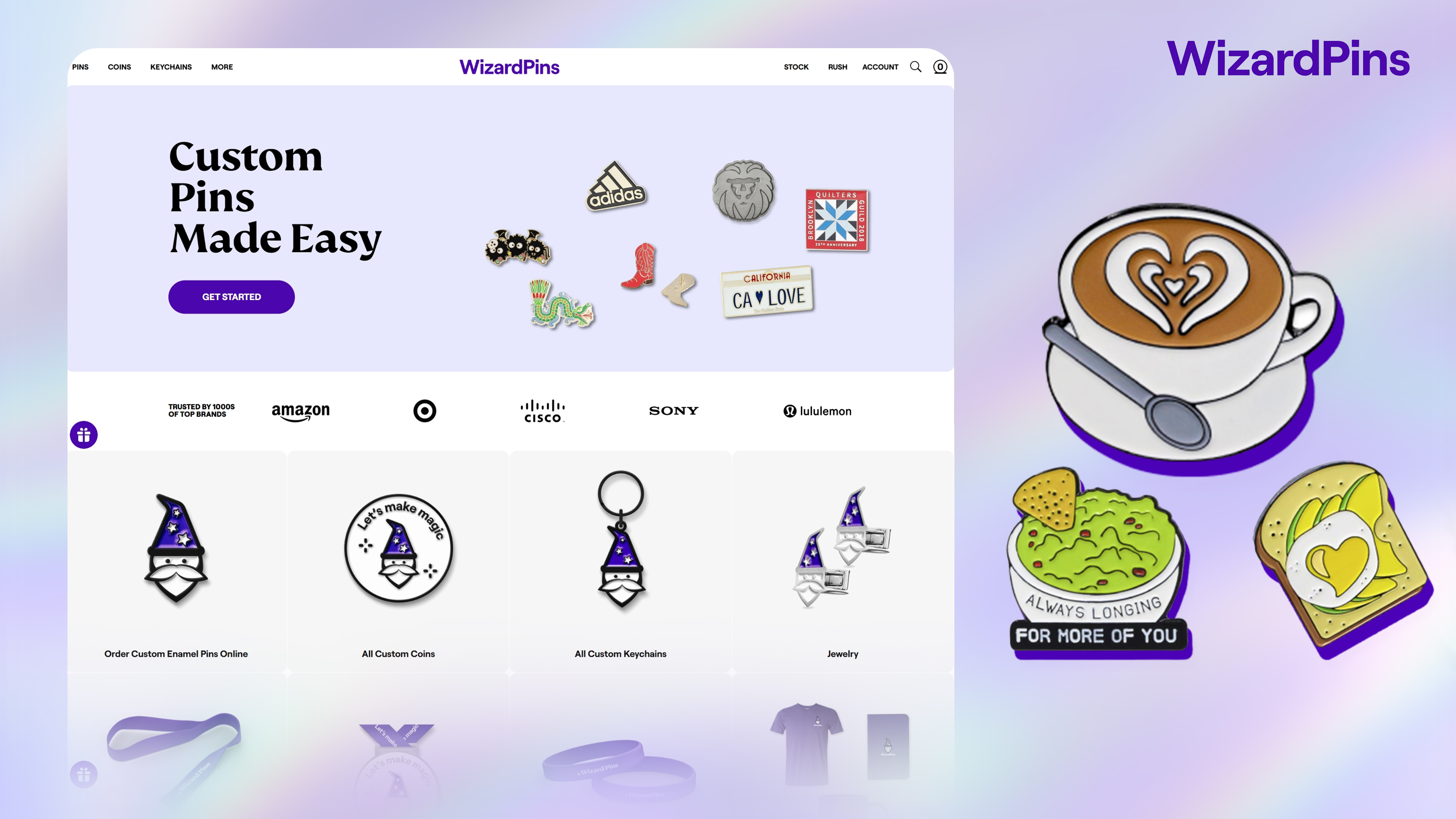 ● Pin options-WizardPins offers customization for four types of pins: enamel, die-struck, printed, and USA pins.