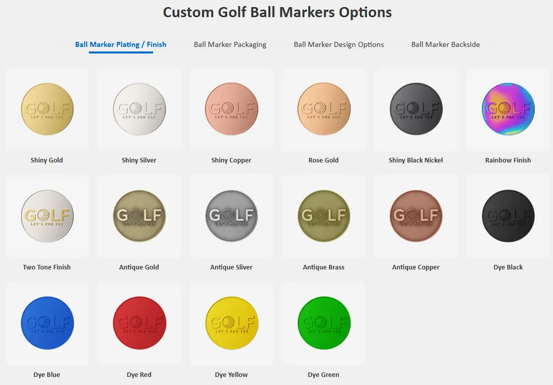 The look and feel of your custom ball marker will be determined primarily by your selection of plating, coloring technique, and surface finish. These components determine not only the final look of the product, but also affect in durability, texture, and quality.