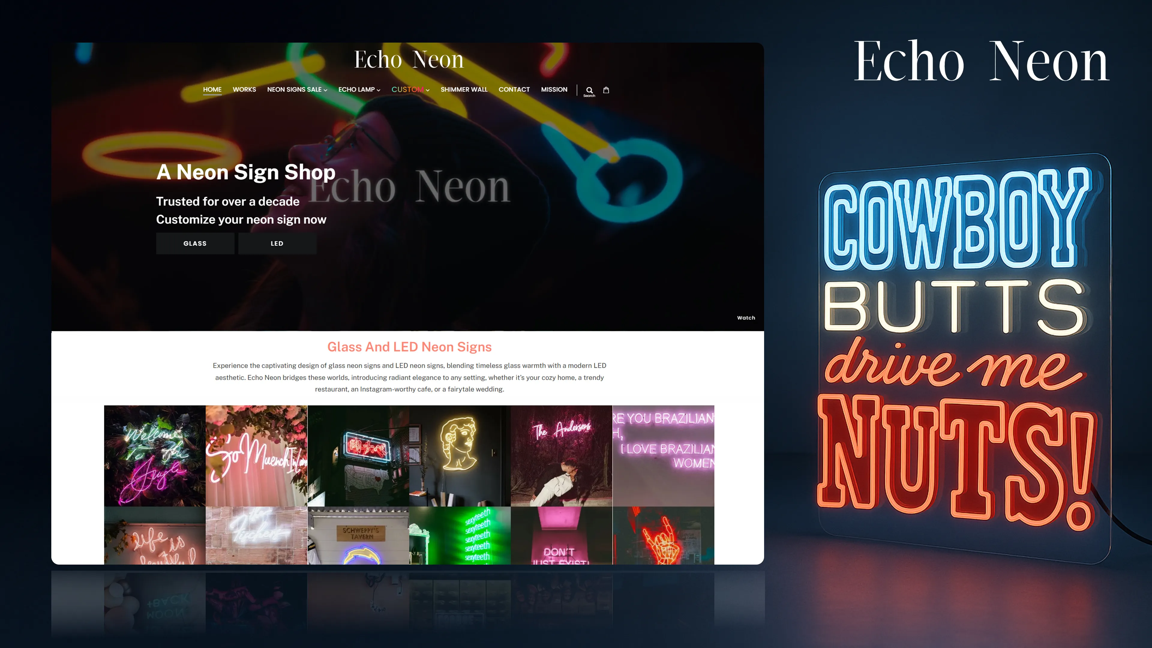 Echo Neon has been in the neon sign industry for a decade. Building long-term customer trust, they craft both glass and LED neon, blending the design of glass and the modern attractiveness of LED to present customers with pretty, individually customized items.