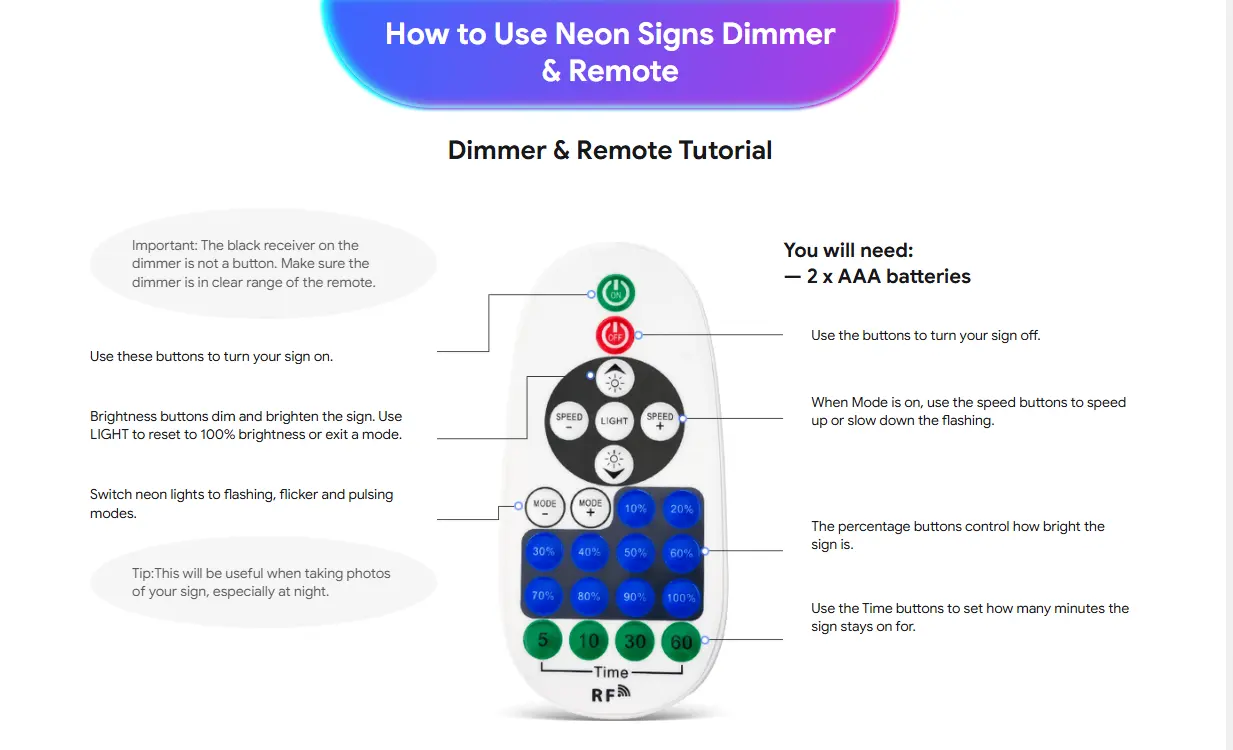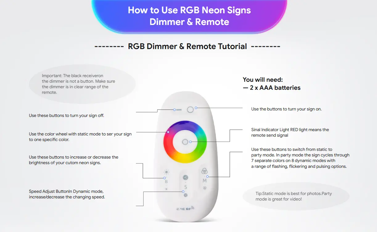 There are two types of neon sign remote controls: the Standard Dimmer & Remote and the RGB Dimmer & Remote. Before using the remote, ensure the neon sign is connected to a power source and that there are no obstructions within the remote's range.