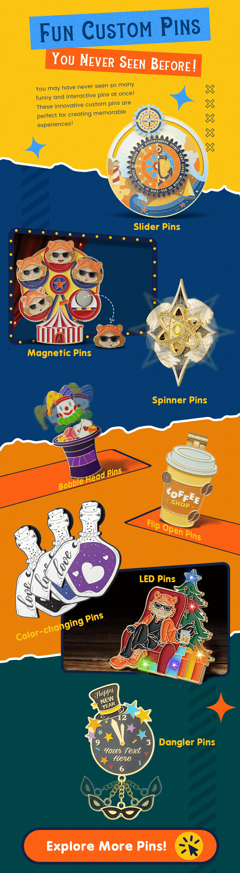 3. Spinner enamel pins: The pin head rotates, creating a whimsical or interactive design.