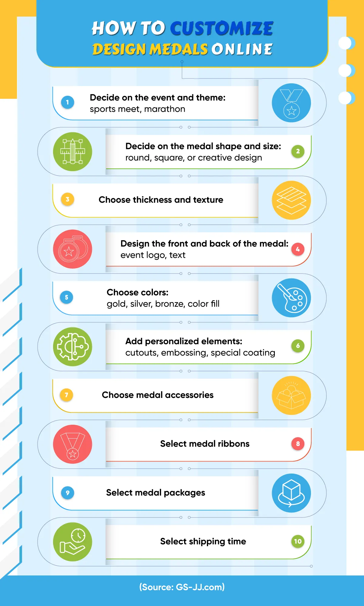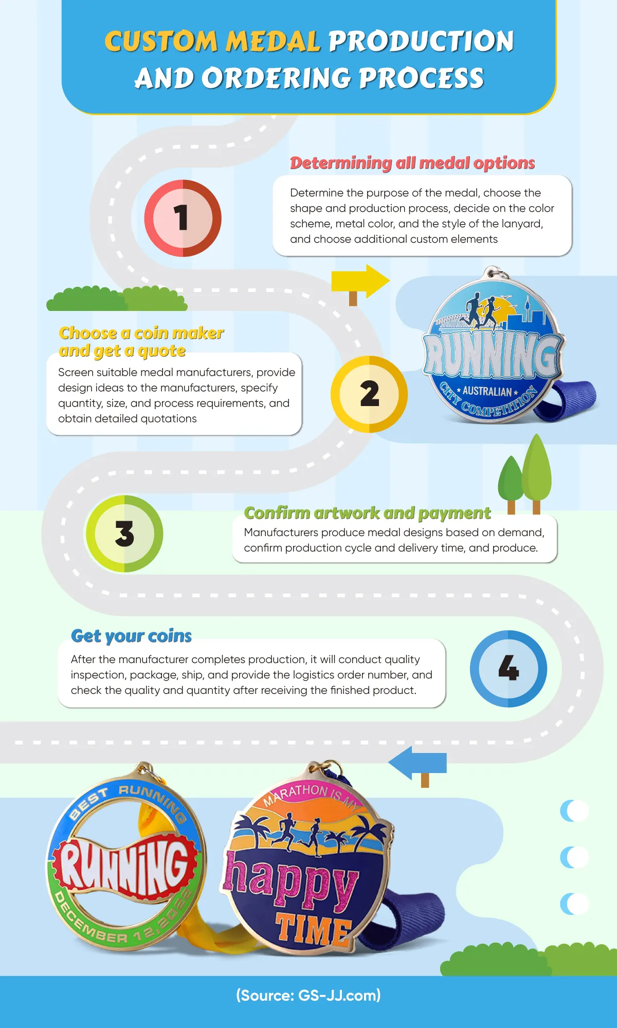 The purpose of the medal; select the material, shape, size, and production process; and decide on the color scheme, metal color, lanyard style, and medal packaging.