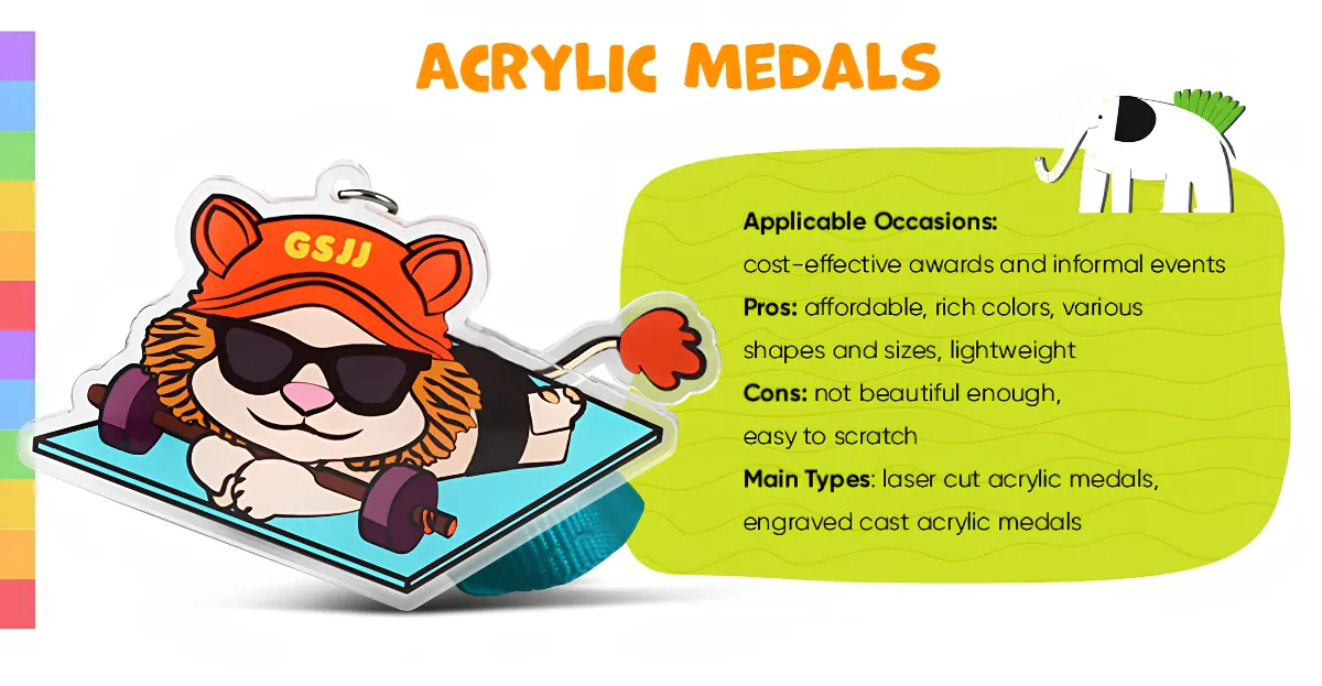 Features: Acrylic medals are lightweight, waterproof, and cost-effective. The designs are primarily printed, resulting in bright colors.