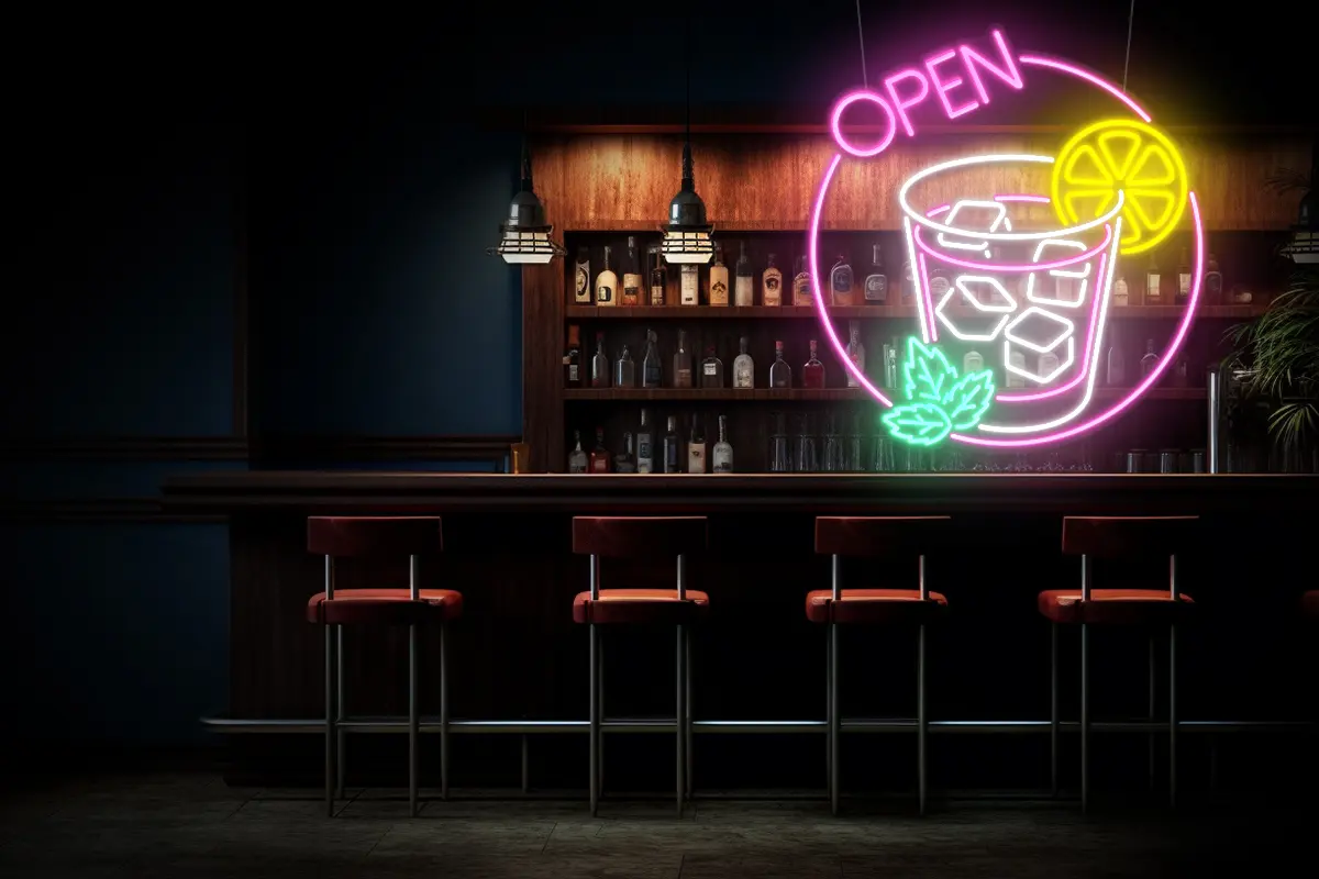 The presence of neon signage is universal in establishments. Phrases such as "We'll start with a cocktail" and glowing menu boards add a fun aspect to nightlife experiences. Bars will often employ neon to highlight specialty cocktails, not unlike how restaurants use neon art decoratively. A nice neon sign can add a modern, cozy, and nostalgic vibe to a venue.