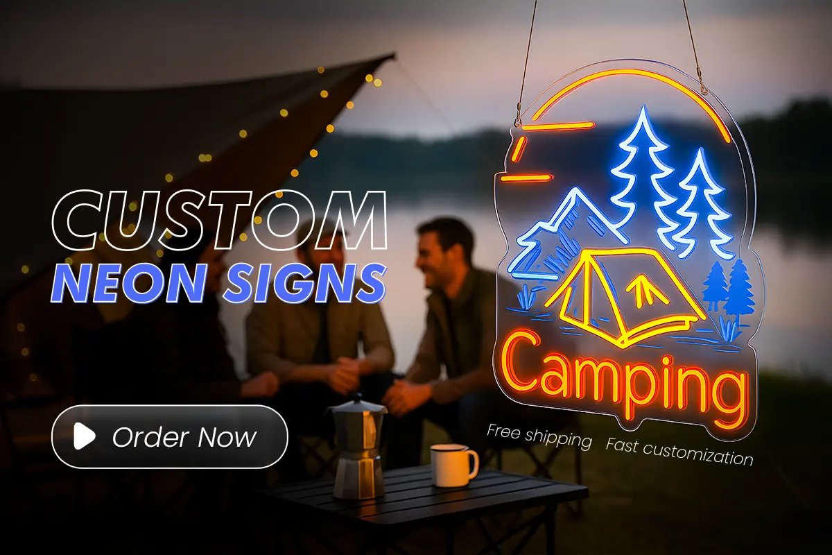 Neon signs are not just for inside. They can help enhance the mood of an outdoor camping environment - add atmosphere to and around a campsite and a tent, or like a campfire circle. Portable neon, or LED neon-style lights, will make the adventure more fun and memorable outside!