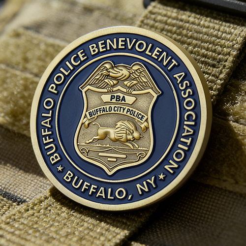 The New York Buffalo Police custom coins are die-struck with four-colour fills and have great craftsmanship on both sides. Buffalo police custom challenge coins have been highly carved with boats on the river and the brown buffalo working in the field. So interesting. And the PBA logo is clearly depicted on the blue background. It's a great gift for your favourite policeman with this challenge coin custom.