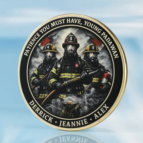 Our custom challenge coins showcase a dual-sided design blending firefighting honor with playful Star Wars charm. The obverse highlights three heroic firefighters in full gear amid swirling smoke, with Yoda at the base, encircled by the phrase “PATIENCE YOU MUST HAVE, YOUNG PADAWAN” and personalized names. The reverse presents a classic fire department Maltese cross emblem, inscribed with core values like “BRAVERY” and “TRUST,” plus the captain’s name and “2025.” A polished gold metal rim frames each side, delivering a refined, durable texture with crisp, vivid printing of every intricate detail.