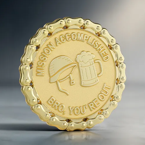 This Mission Accomplished veterans coin is crafted with precision. Its edge features a chain design, and the metallic luster conveys a profound and substantial feel. It replicates the tough symbols from military memories. Customized features a fusion of elements from military helmets and beer mugs; the helmet represents the responsibilities and honors of one's military service, while the beer mug conveys the relaxed camaraderie among comrades after retirement.