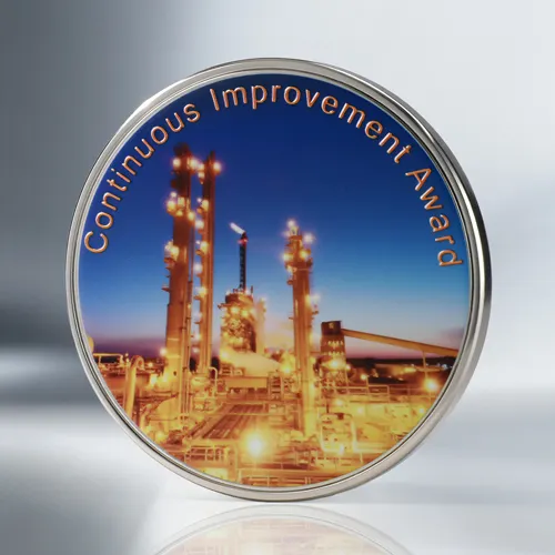 Featuring a striking industrial scene at night, the front displays a brightly lit refinery complex under the arched text "Continuous Improvement Award." The reverse side showcases the prominent CVR Energy logo in the center, surrounded by core values like Safety, Environment, and Integrity on a clean white background. Encased in a polished metal rim, these custom challenge coins exhibit a professional finish suitable for corporate recognition. The detailed imagery and clear typography highlight the commitment to excellence, making them a perfect symbol for employee achievement and operational success.
