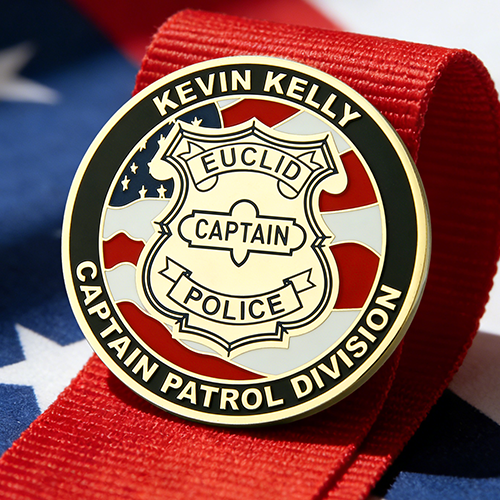 Euclid Captain Police custom coins. Honour and award the dedicated policemen and policewomen with the special Police challenge coins. These Euclid Police custom coins feature a police badge at stars and stripes background, hand-filled with 4 enamel colours, and printed "Captain Kevin Kelly" on the top. On the slip side of custom coins, there are highly engraved with the Euclid Police Department symbol and crossed flag.