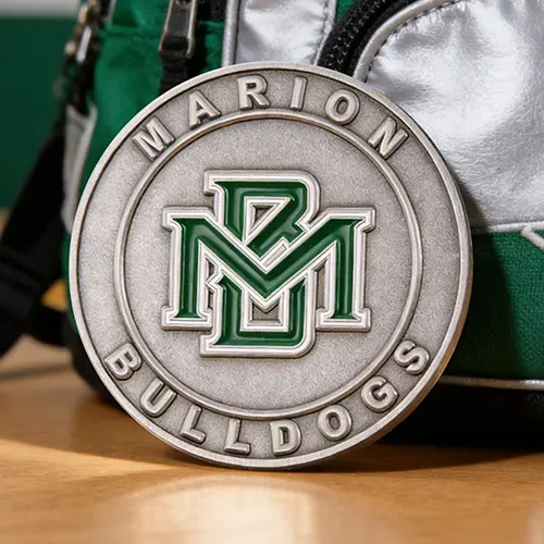 Marion Bulldog Athletics custom coins are cheap challenge coins, polished with an antique silver finish. And coins for sale are available in different finishes, shapes, or other forms. You can select what you want on our Automated Quotation System online. Each custom coin comes packaged with an individually packaged PVC bag for security, and custom challenge coins with no minimum are available for your orders at GSJJ.com.