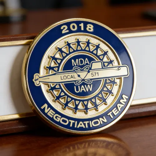 MDA-UAW Local 571 challenge coins are cheap challenge coins, polished with a gold finish. Metal areas are raised, and coloured parts are recessed. All challenge coins come in different colours and finishes if you like. Each custom coin is attached to an individual PVC bag, and custom challenge coins with no minimum are available.