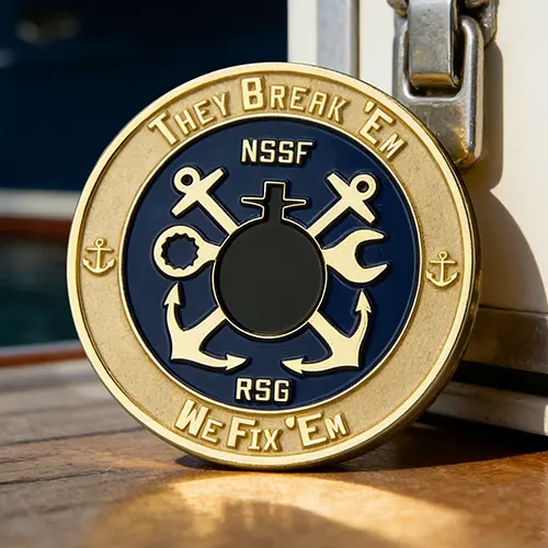 As part of the Navy support department, NSSF (Naval Submarine Support Facility) was realigned under the Regional Support Group (RSG) and played an important job of maintaining the overall safety process. The Military challenge coins recognise the significant contributions of NSSF and RSG to Navy safety and occupational health. NSSF Military challenge coins feature crossed anchors and tools on a blue background, and the flip side is highly engraved with two submarines behind stars and stripes.