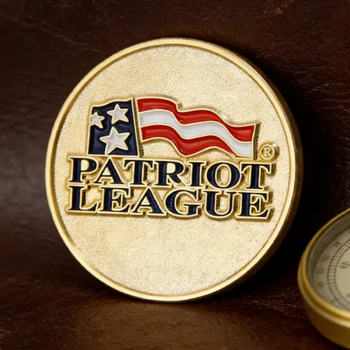 Patriot League challenge coins are made for the members of the collegiate athletic conference. The Patriot League coins are sandblasted challenge coins, designed with the Patriot League logo on the surface, which are filled with three enamel colours. And the flip side of challenge coins is blank, with no logo and text. The cute size and simple style make these tiny challenge coins more outstanding.