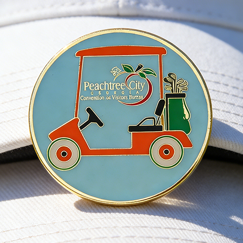 Peachtree City Custom Coins are customized for the Department of Convention and Visitors Bureau. These challenge coins for sale feature an orange golf cart and a peach symbol on a slight blue background. It is dual-sided and filled with four enamel colors, gold-plated to a beautiful appearance. What's more, the two sides of those custom coins are the same design. Award excellent staff and members in the Bureau with these cute and awesome custom coins.