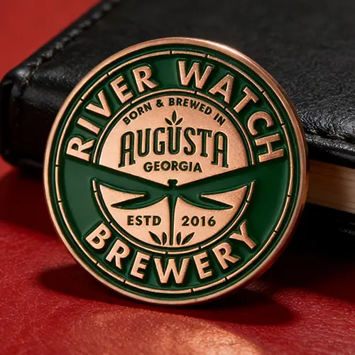 Augusta, Georgia's first craft brewery, is River Watch Brewery. To remember and commemorate River Watch Brewery members for their contributions with River Watch Brewery coins. These challenge coins are handed fill with green enamel colour border, feature the brewery-themed hop/grain symbol, and text is plated in copper colour.