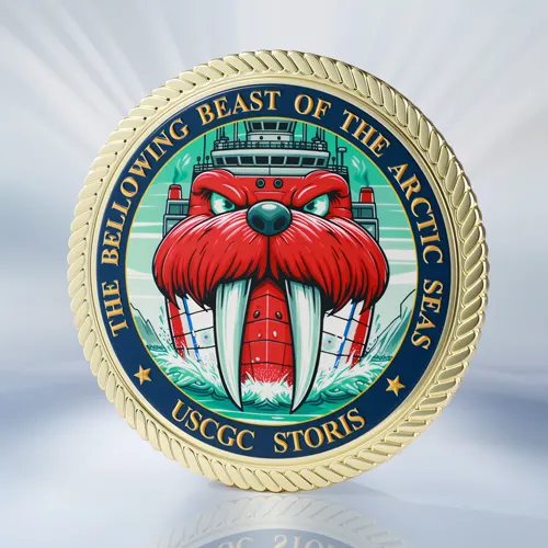 US Coast Guard Arctic Service custom challenge coins honor the legendary USCGC Storis icebreaker, boasting an intricate twisted rope edge and vivid, detailed artwork. The obverse showcases a striking walrus-warship hybrid graphic paired with the slogan "The Bellowing Beast of the Arctic Seas", while the reverse features a precise Arctic Circle map, engraved U.S. Coast Guard lettering, and "Seattle, WA" marking. Crafted with a meticulous production process, it stands as a premium collectible for service members, veterans, and coin enthusiasts.