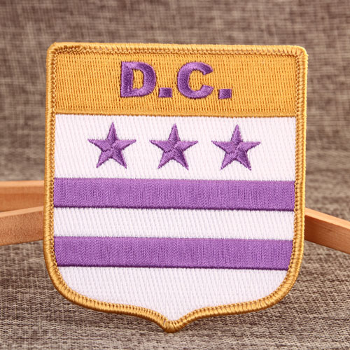 The construction of D.C. Cheap Custom Patches are very special. At the top is a DC stitched with purple thread, the second row had three stars, also sewn with purple thread. Below the patch are a white background and two purple bars. The entire patch is made up of orange, purple and white. The border of D.C. Cheap Custom Patches is merrowed, it has a iron-on backing, with 100% embroidery. D.C. Cheap Custom Patches measures 3.1 inches tall (measured from the widest point) by 3.5 inches wide, There is no minimum for D.C. Cheap Custom Patches. Welcome your inquiry.