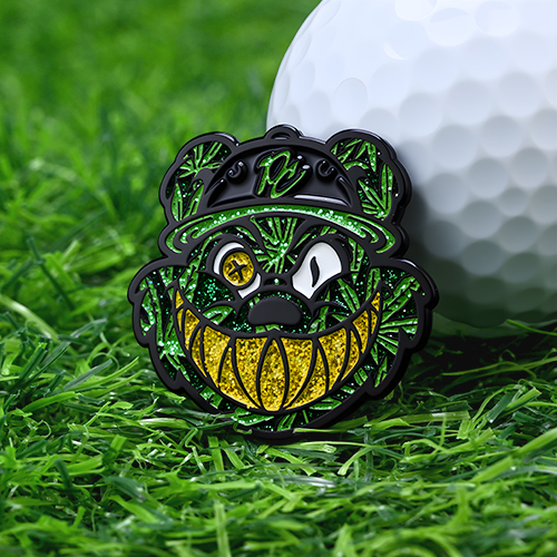 This custom golf ball marker has a unique design and exquisite craftsmanship. In the vast world of golf, it is a clear manifestation of the personality of golfers. The overall shape of the ball marker is a unique green bear head with a black hat on its head. Under the brim of the hat is the eye covered by a golden button, exuding a mysterious and dangerous atmosphere. The bear opens its mouth wide, revealing a mouthful of golden fangs, which are sharp and flashing with cold light, as if ready to issue a deterrent at any time, declaring itself the king of the green. This design style breaks the convention, showing a special sense of evil, cool, and handsome.