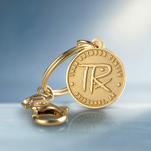 This premium gold-toned metal keychain features a 2" diameter circular keychain, engraved with a minimalist “TR” monogram and a subtle border of text. Equipped with a durable lobster clasp and key ring, it’s a sleek, personalized accessory for everyday use. If you’re searching for keychains near me, this stylish, functional accessory is a perfect choice for adding a custom touch to your keys or bag.