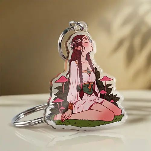 Character keychains featuring a mystical forest elf character are produced using a high-quality standard acrylic process, ensuring the vibrant pink mushrooms and lush green grass of the background remain crisp and durable. The die-cut shape follows the elegant silhouette of the character, who is depicted in a graceful seated pose with long red hair and a detailed white outfit. This customizable anime accessory perfectly captures the whimsical forest theme, making it a stylish and charming addition to any collection.
