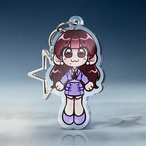 Character keychain designs featuring a charming chibi-style anime girl dressed in a purple school uniform stand out with their clean, high-quality standard acrylic finish and smooth transparent edges. The vibrant purple and deep maroon tones of the character’s hair and outfit are perfectly captured in the crisp, double-sided printing, while the durable die-cut silhouette mimics the playful outline of the illustration. A sleek silver star-shaped metal clasp completes the look, transforming this customizable anime accessory into a stylish and functional addition to any collection.