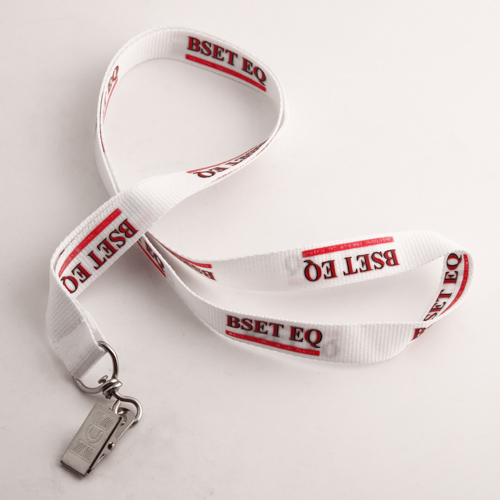 The BSET EQ Cheap Lanyards is crafted from the white polyester fabric material with lower cost. The polyester lanyards are soft and comfortable. And they are portable and endurable. But the nylon lanyards have the best quality and is expensive than other material lanyards. The low price lanyards are adopted for the silkscreen printing process to print the logo. The lanyards design is simple and clear. The red and black inks are attached on the surface of the low price lanyards through high pressure. The red words on the white background reflect brighter spirit. Both sides of the BSET EQ Cheap Lanyards have printed text, which can maximize powe of promotion of the brand and goods. All of the BSET EQ Cheap Lanyards have added a metal bulldog clip accessory. You can wear the ID badges and work card on it. Hanging objects on the accessory is an important function of the customize lanyards.