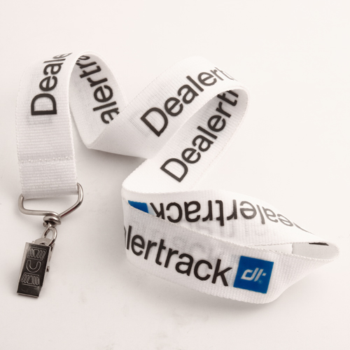 GS-JJ uses the white polyester fabric material to make the best lanyards. The white polyester lanyards are best used in office area.. If you used it in dusty environment, the Dealertrack Low Price Lanyards smudge easily. But you don’t have to worry about it. The polyester lanyards are easy to clean and dry. Because of its simple graphic and text, we use silkscreen printing process to print them. The font and logo printing are completely done according to the company’s original trademark. The blue square logo adds beauty to the best lanyards. Both sides of the custom made lanyards have printed company’s name and logo. Of course, the attachments of the customize lanyards have different styles. You can select it by your own requirements and hobbies. The Dealertrack Low Price Lanyards attachment is a metal bulldog clip. It is a shape of a clip, and suitable to fix your work card.