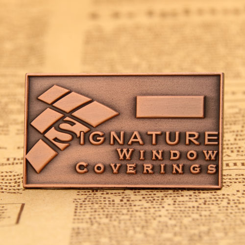 The Copper square custom pins were ordered by a window coverings manufacturer for their advertising promotion. The pins are made square to express window coverings. And the words in the pins printed Signature window coverings. The pins of material used copper, and the back of the die-struck was blasted with black nickel. The copper pins are not only advertising promotion but also pride pins or army pins. As a prize pin, a reward to an employee for their achievement. Army pins often encourage the soldier to make progress. Cheap pins wait for you to order. Go.