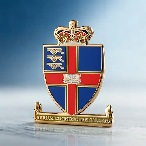This prestigious hard enamel pin features a regal shield crest, complete with a crown topper and the classic Latin motto "RERUM COGNOSCERE CAUSAS." At 1.5" with a shiny gold finish, these custom pins are the perfect high-end accessory for any academic or heritage-inspired collection.