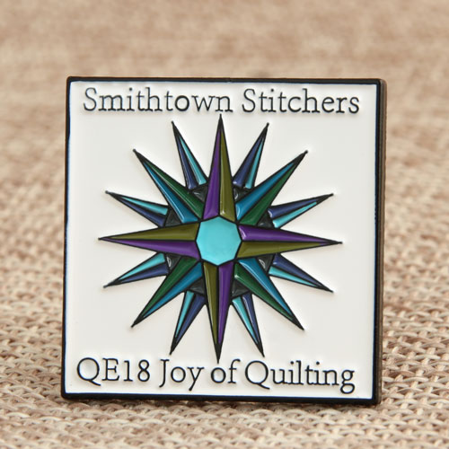 These Custom SmithtownStitchers pins look unpretentious, and the shape of the pin is very regular, with a square that is one inch long. A touch of color, the only color is the middle of the color ball, green, purple, blue, brown, and the shape is a bit like a prickly pear. The white background looks very elegant, the Pin Design is very simple, a graphic with text, the text of these Custom Smithtown Stitchers pins is its name, you can also match some of your favorite words, phrases, or sentences. The pins are surrounded by black plating, which complements the white background.