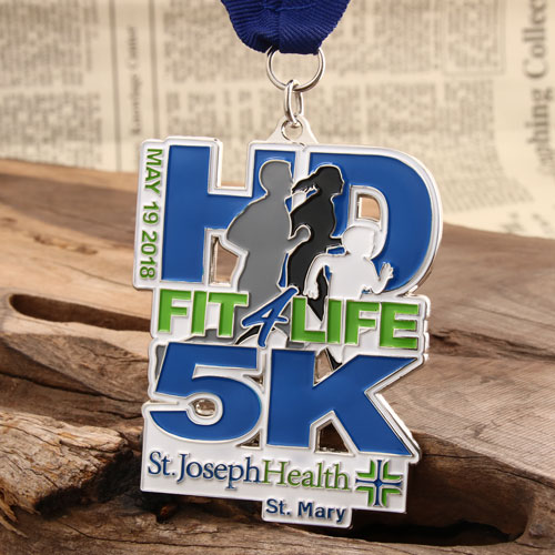 St. Joseph Health Center organizes an annual Healthiest Community 5K Fit 4 Life community run/obstacle course on Saturday, May 19, 2018. Fit 4 Life is designed to improve the overall fitness of people seeking to live happier, healthier, more productive lives. Fit 4 Life offers not only products like fitness equipment but also health information. Obviously, 3D 5K custom race medals are crafted by 3D and cut out technology. There are three people on the 3D 5K Custom Race Medals, which standards for men, women, and children. The main colors of 3D 5K Custom Race Medals are green and blue, which represent being healthier. Each of them will be poly bagged and attached to a blue ribbon.