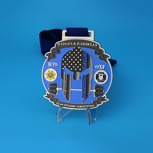 Custom medals are made for the annual Badges and Barbells Competition. The custom medals are designed with a huge body in 3.5 inches, filled with five enamel colors on the front side. And Badges and Barbells competition custom medals feature a barbell symbol and BCPD and OXF logo, and many silver stars recessed on a blue background. Congratulations to all the excellent players who received such awesome sports medals.