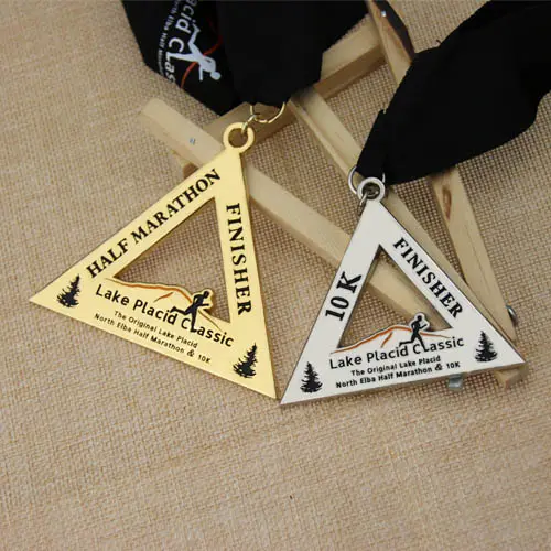 These custom medals are custom race medals, designed ina unique triangle shape, crafted with ga reat cut-out design in the inner part, fully with shiny gold-plated. All custom award medals are attached with standard ribbon and protective poly bag, and available in gold, silver, and copper color etc. Custom medals: no minimum quantity required for custom order.