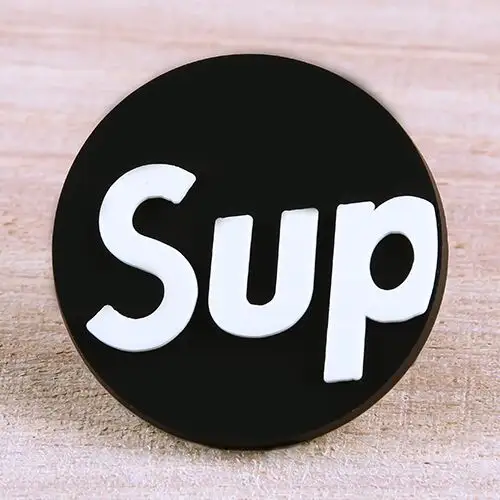 SUP PVC Patches is a black and round PVC patch, that is about 1.5 inches, and we can see the white texts “SUP” in the middle of SUP PVC Patches. So the SUP PVC Patches is a logo for SUP Brand. SUP is a clothing brand born in the United States. It is also a fashion brand logo, whose full name is Supreme.