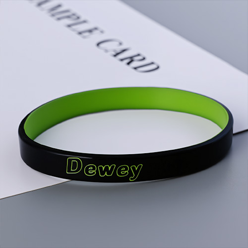 These custom wristbands come from an educational aid company. The two-color wristbands are debossed with "Dewey" and the company website. The special embossing process makes the hollow font look very artistic. The silicone wristbands are soft and slender, and they feel completely free of restraint when worn. The grass green inside and the black outside are both calm and low-key and have a bright and fashionable sense of matching. This kind of personalized wristband design is GSJJ's specialty. If you want to create the best quality wristband at the lowest price, please contact us now. View More