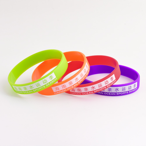 These Hainan Ocean Sports Season Wristbands are handled by the printed process, “Hainan Ocean Sports Season” was printed on this batch of rubber wristbands custom cheap by white ink.