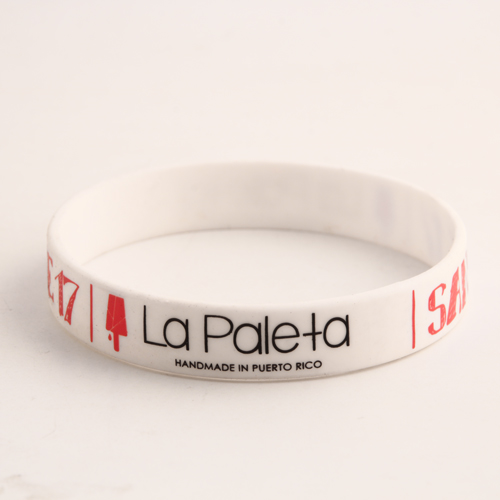 Printed wristbands cheap are simply the trending fashion on the history of custom silicone wristbands. They are the most popular items overall as they can be used for almost any event. Look at these white awesome wristbands, two kinds of fonts were printed on them respectively with red and black ink. According to a message of “La Paleta”on these wristbands, we named them” La Paleta Wristbands”, two colors fonts made the message that the La Paleta Wristbands need to convey very clear and eye-catching, and these La Paleta Wristbands can be worn by people of all ages, perhaps this is what makes such kinds of wristbands so popular.